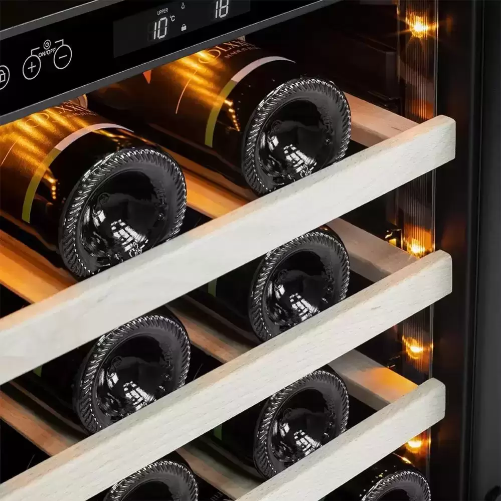 Двухтемпературный винный шкаф, Дверь со стеклопакетом, Материал полок дерево, Фильтр из активированного угля, Индикация повышения температуры, Внутреннее освещение